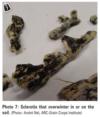 The fungus overwinters as sclerotia (Photo 7) in the soil and in plant debris. Sclerotia may survive for up to four years in the soil. In summer when sunflower roots come in contact with the sclerotia, the sclerotia germinate and infect the roots.