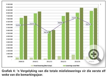 Totale mielielewerings vir die eerste elf weke van die bemarkingsjaar, ingesluit vroeë lewerings (Maart en April), beloop reeds 8 843 401 ton. Daar is dus 63,7% van die Nasionale Oesskattingskomitee (NOK) se finale produksieskatting gelewer (Grafiek 4).