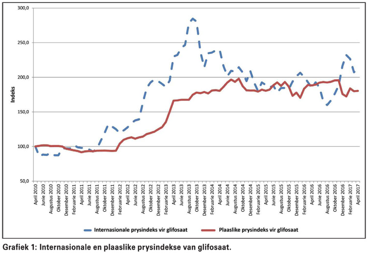 Hieruit kan afgelei word dat die prys van glifosaat skerp gestyg het, terwyl die pryse van ander onkruiddoders tussen 6,8% en 9,2% gedaal het. Omdat die wisselkoers byna met 8% versterk het, kan gesien word dat onkruiddoders (glifosaat uitgesluit) in randterme oor ‘n jaartydperk met meer as 10% gedaal het. Dieselfde tendens word in die plaaslike mark verwag.