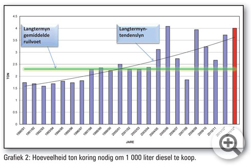 Grafiek 2 dui aan hoeveel koring benodig word om 1 000 liter diesel aan te koop. Uit die grafiek (tendenslyn) kan gesien word dat die koring/diesel ruilvoet sedert 1990 dramaties verswak het. Die langtermyn gemiddelde ruilvoet is 2,7 ton koring vir 1 000 liter diesel, terwyl die verwagte ruilvoet vir die komende seisoen 4 ton is. Dié ruilvoet het baie verswak sedert vyf jaar gelede (2007/2008-produksieseisoen) toe die ruilvoet 1,9 ton koring vir ‘n 1 000 liter diesel beloop het.