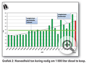 Dit is nie net die koring-/ureumruilvoet wat beter as verlede jaar vertoon nie, maar ook die koring-/dieselruilvoet. Grafiek 2 dui aan hoeveel koring benodig word om 1 000 liter diesel aan te koop. Uit die grafiek (tendenslyn) kan gesien word dat die koring-/dieselruilvoet sedert 1990 verswak het, maar dat dit beter as verlede jaar is. Die langtermyn gemiddelde ruilvoet is 2,4 ton koring vir 1 000 liter diesel, terwyl die verwagte ruilvoet vir die komende seisoen 3,8 ton is.
