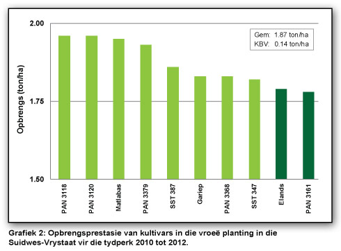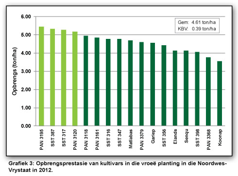 Die kultivarprestasie vir die eerste planting in die Noordwes-Vrystaat (2012) word in Grafiek 3 weergegee. PAN 3195, ‘n nuwe inskrywing in die 2012-reeks proewe, het die hoogste opbrengs gehad, gevolg deur SST 387, SST 317 en PAN 3120. Laasgenoemde drie kultivars het nie statisties betekenisvolle laer opbrengste gehad as PAN 3195 nie.