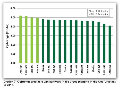 Die gemiddelde opbrengs in 2012 van al die kultivars in die gebied was 4,72 ton/ha (Grafiek 7). Dit is aansienlik hoër as in 2011, toe ‘n gemiddelde opbrengs van 2,32 ton/ha behaal is. Die beste prestasie is gelewer deur PAN 3161, gevolg deur PAN 3368, SST 317 en SST 316. Laasgenoemde drie kultivars het nie statisties betekenisvol van PAN 3161 verskil nie.