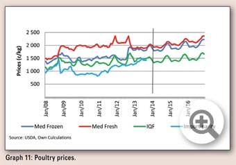 This is especially true should the exchange rate continue to strengthen. Poultry prices are therefore expected to continue to move sideways with very little upward potential. The industry has however cleaned up its act and lowered the amount of water that is injected into the frozen product, hence the increase in price of whole frozen birds. However to be able to compete against the very cheap individually quick frozen product (IQF), they still need to lower brine injection percentages.