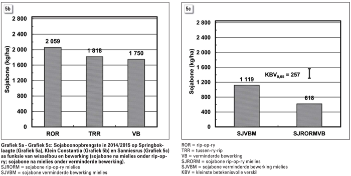 Grafiek 5a toon dat op Springboklaagte-sojaboonopbrengs na mielies onder rip-op-ry betekenisvol hoër was as onder verminderde bewerking (1 480 kg versus 955 kg/ha). Op Klein Constantia is die herhalings nie apart gestroop nie en kon geen statistiese vergelykings getref word nie. Omdat dit die eerste seisoen van wisselbou was, kon slegs die bewerkingseffek op sojaboonopbrengs waargeneem word, naamlik dat rip-op-ry die hoogste opbrengs van 2 059 kg/ha gelewer het (Grafiek 5b). Op Sanniesrus (Grafiek 5c) het sojabone na mielies onder rip-op-ry teen 1 119 kg/ha byna 100% hoër opbrengs gelewer as onder verminderde bewerking.