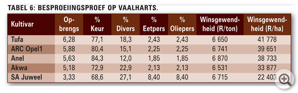 In Vaalharts het Tufa weer eens goed presteer en op droëland ‘n opbrengs van 6,06 ton/ha behaal. Die hoë opbrengs lei daartoe dat Tufa ‘n winsgewende produksie van R41 592/ha behaal het. Die naaste vergelykende kultivar is ARC Opel1 wat R32 471/ha behaal het. Die keurpersentasie van Tufa is egter swakker as Anel en Akwa en is naas laasgenoemde, derde in terme van R/ton ten opsigte van winsgewendheid. SA Juweel het op Vaalharts ‘n baie swakker opbrengs (1,70 ton/ha) in vergelyking met die ander kultivars opgelewer. Die kultivar het die swakste ten opsigte van winsgewendheid op Vaalharts gevaar (Tabel 3).