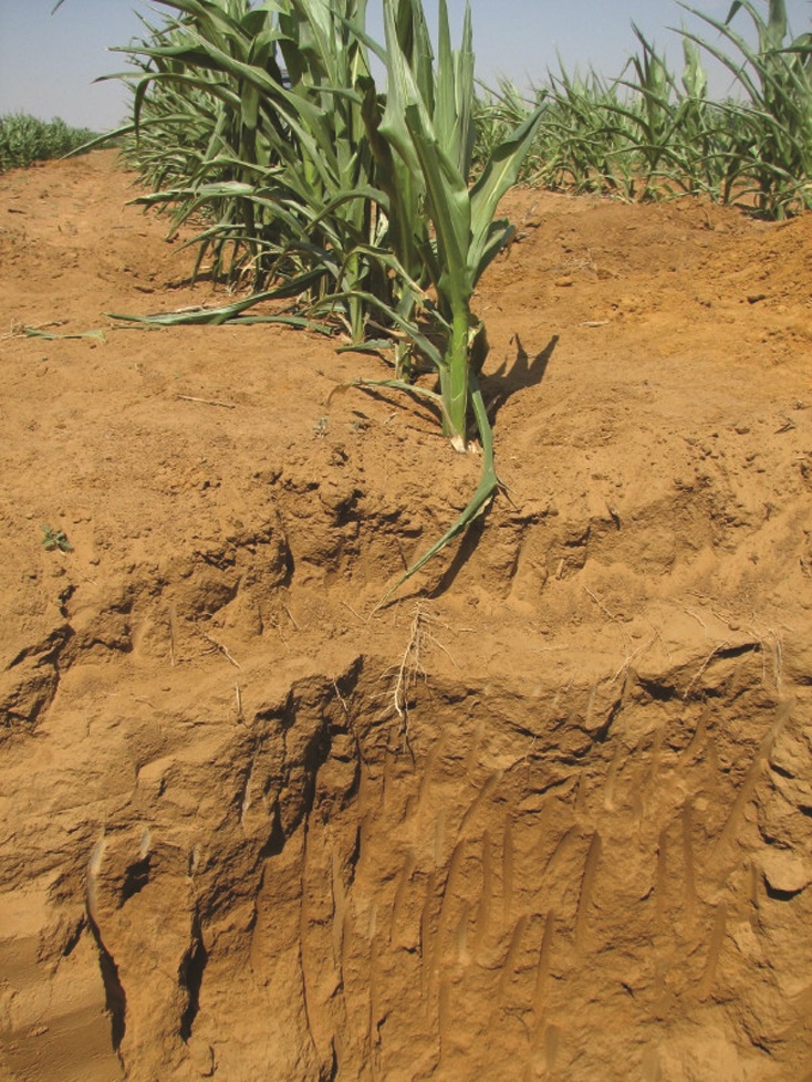 The maize is dying on the top, but there is moisture under the compaction layer. Only a deep rip action will break the plough pan effectively.