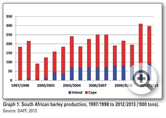 Until 1997, the production of barley was almost exclusively limited to the Southern Cape. Production on an experimental basis was only brought to the inland irrigation areas of Vaalharts during 1997. Today the inland irrigation areas produce on average around 75 000 tons on 14 000 ha. The production of barley is mainly concentrated in three irrigation production areas, namely Vaalharts (about 33 000 tons), GWK (about 17 000 tons) and Taung (approximately 7 000 tons).