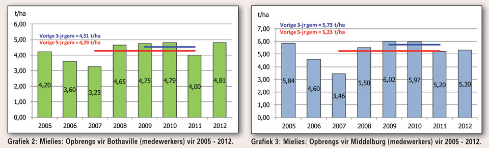 Die huidige seisoen (2012) se opbrengs vir Bothaville (Grafiek 2), naamlik 4,81 ton/ha is die hoogste oor die tydperk van agt seisoene en 0,81 ton/ha hoër as die vorige seisoen se gemiddelde opbrengs van 4,00 ton/ha. Die huidige seisoen (2012) se opbrengs vir Middelburg (Grafiek 3), naamlik 5,30 ton/ha is bykans dieselfde as die vorige vyf jaar se gemiddelde opbrengs van 5,23 ton/ha, maar effens hoër as die vorige seisoen se gemiddelde opbrengs van 5,20 ton/ha.